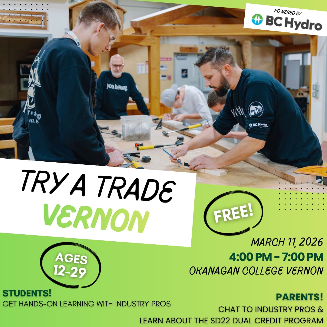 Do you have someone in your household aged 12-29 who is interested in learning more about a career in the trades? Then this event is for them and YOU, the parent/caregiver. To bolster the development of trades talent in the Central Okanagan, the Canadian Home Builders' Association - Central Okanagan (CHBA-CO), along with Okanagan College, is thrilled to introduce TRY-A-TRADE presented by BC HYDRO. This event will demystify the world of trades and inspire the next generation of builders. Students will experience two hands-on workshops that will each be 45 minutes in length. Led by OC instructors with mentors from our local residential construction industry. During the same time, parents have the option to attend up to two panel presentations with discussions from industry experts on what a career in the trades looks like, the future of the industry and more. The second panel will focus on the dual credit program offered throughout SD22.This is a FREE event to attend. Light bites will be offered. Tradeshow opportunity before and during the event with industry partners. Don't miss out - there are only 60 spots available for students.