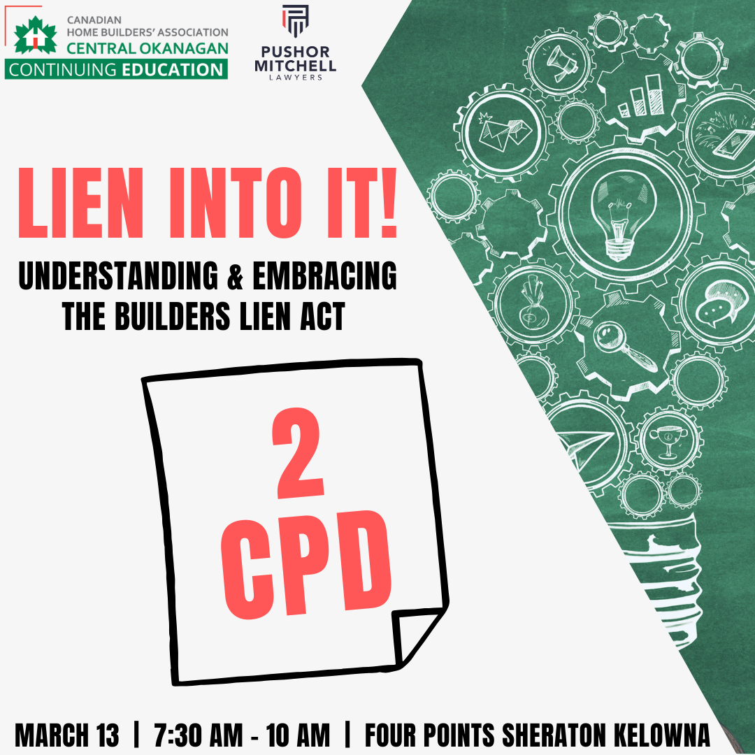 What can you do when faced with an unpaid invoice or a claim of builders lien appears on title? Whether you like it or not, the Builders Lien Act applies to construction work throughout British Columbia. Join Pushor Mitchell LLP lawyers Mark Danielson, Darcy Whittaker, and Delaney Long as they guide you through the complexities of preparing, filing, and removing builders liens. This session will address key issues related to preparing and filing a claim of lien, what your options are once filed, as well as the legal options for removing a claim of lien from title. You’ll walk away with practical knowledge to help you understand the Builders Lien Act and effectively manage builders liens in your construction business.