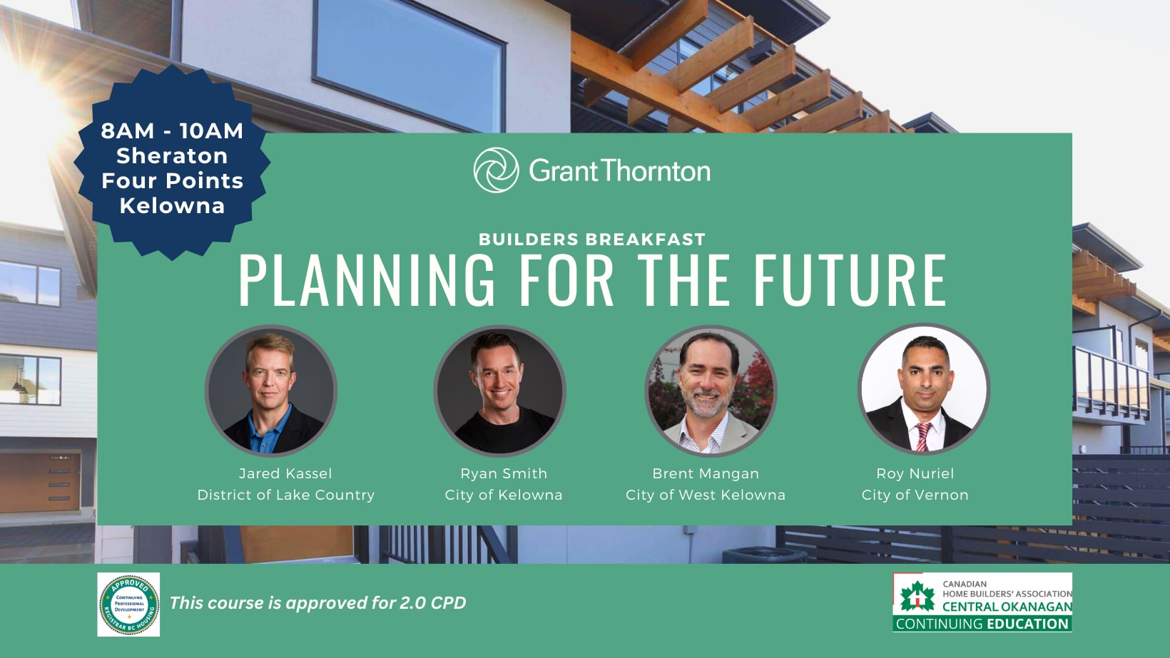 Join us for a Builders Breakfast with Directors of Planning from Kelowna, West Kelowna, Lake Country, and Vernon, as we take a deep dive into how each region is working to meet the challenge of a housing supply that isn't fully keeping up with housing demand, and what steps each jurisdiction is taking to catch up.