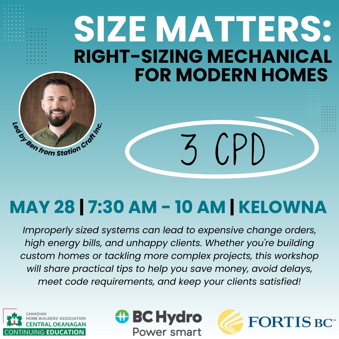 Led by Ben from Station Craft Inc., this engaging and practical workshop will help builders, designers, HVAC professionals, and trades understand how to properly size mechanical systems based on real-world design, performance, and envelope considerations.